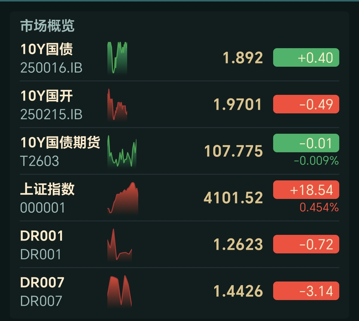 今日股市继续上涨,上证指数突破4100点,商业航天板块继续火热。债市受到压制,但市场情绪比较稳定,10年国债活跃券小幅上行,收益率在1.89%附近。利率债雨天,中短端偏晴,长端较弱;信用债整体晴天,但涨幅不大。国债期货偏弱,全线下跌。公开市场方面,7天逆回购投放340亿,14天国库定存金到期600亿元,合计净回笼260亿。