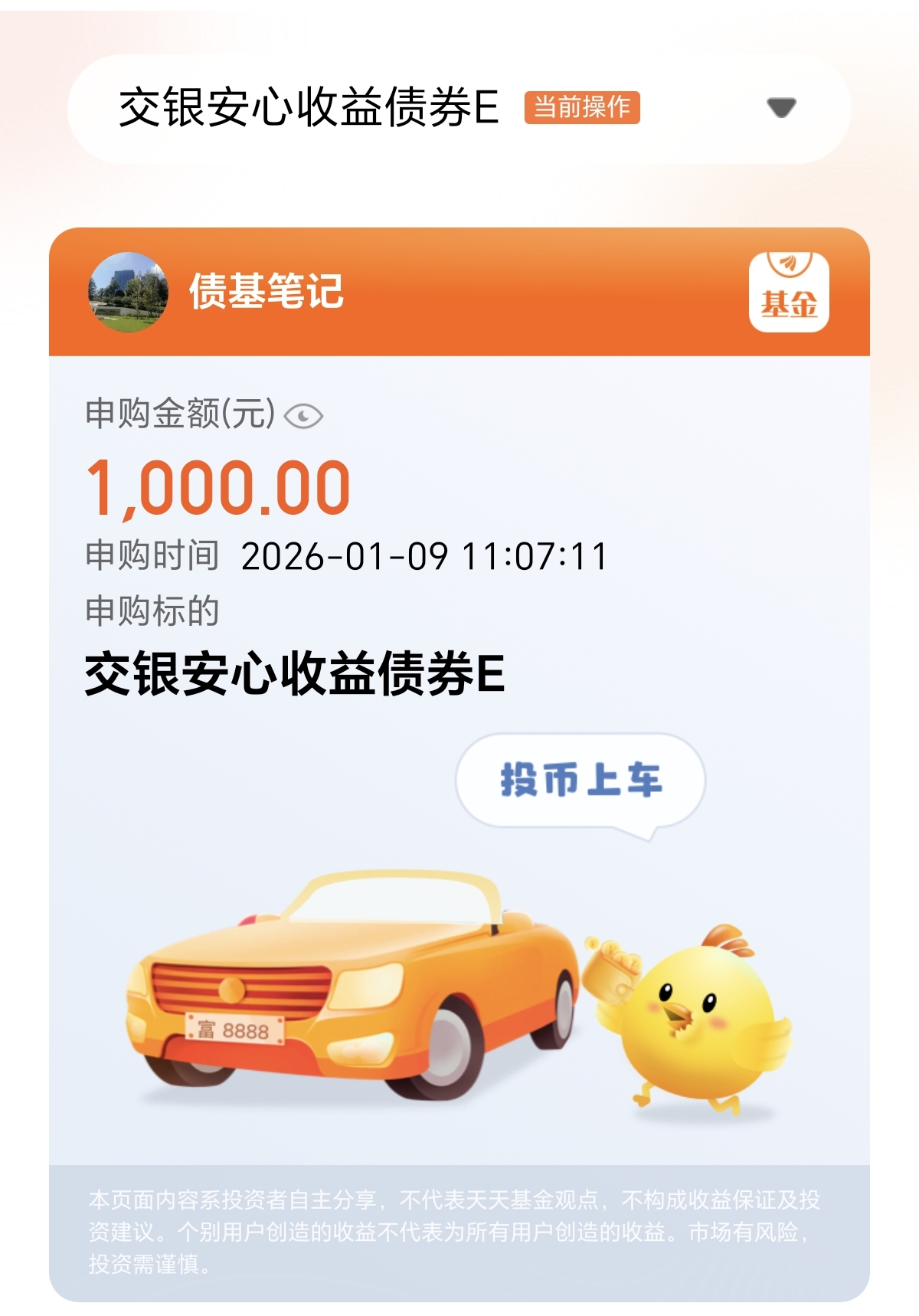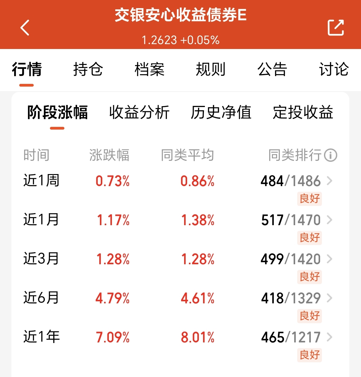 操作策略方面,今天继续买入固收+。继昨天买入交银安心收益债券E(019268),今天再次买入1000元。这只二级债基近1年最大回撤1.35%,跌后恢复较快,净值修复天数35天,波动率2.68%,属于中低波固收+产品,比较契合我低波稳健风格。