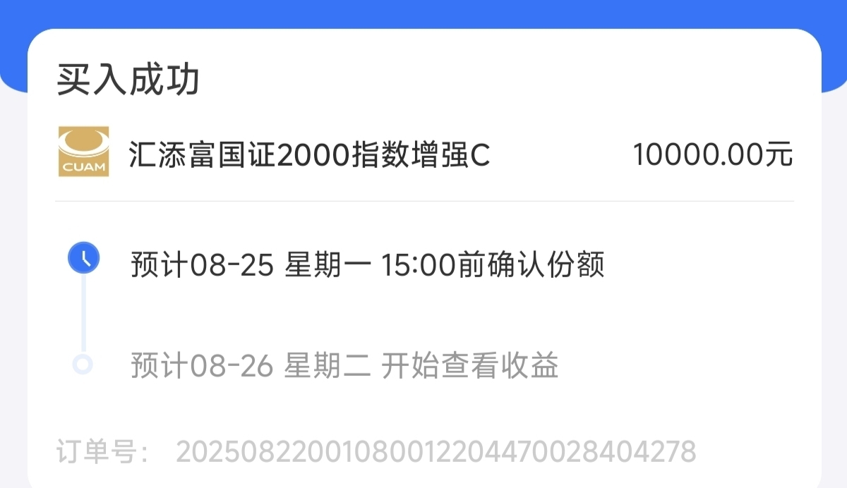 操作!继续上车$汇添富国证2000指数增强C$ 这聚焦小微盘的增强指数基金!昨天市场尾盘出现跳水,前期高位机器人,军工等热门板块集体出现调整,但是指数的表现稳定,所以在这种轮动节奏下,我还是会继续布局指数更省心!该基金紧跟小盘国政2000指数的同时,还采用量化增强的灵活配置,分散化的持仓,行业覆盖通信、汽车、计算机等,受单一板块波动影响比较小!昨天回撤不多,近一年涨幅达到了90.28%,长期同类都是优秀,最近一直在创新高,马上离翻倍也不远了,大幅跑赢了指数的涨幅。而且看了下同属于小盘量化的网红国金量化、中信保诚多策略,近一年都不到80%涨幅,都要高出许多!关键是国金,中信目前已经限购,这里还没有额度的担心!未来随着市场继续突破,小盘股弹性大,估值低,指数未来成长空间大,我也是长期稳稳持有,今天继续补仓10000!