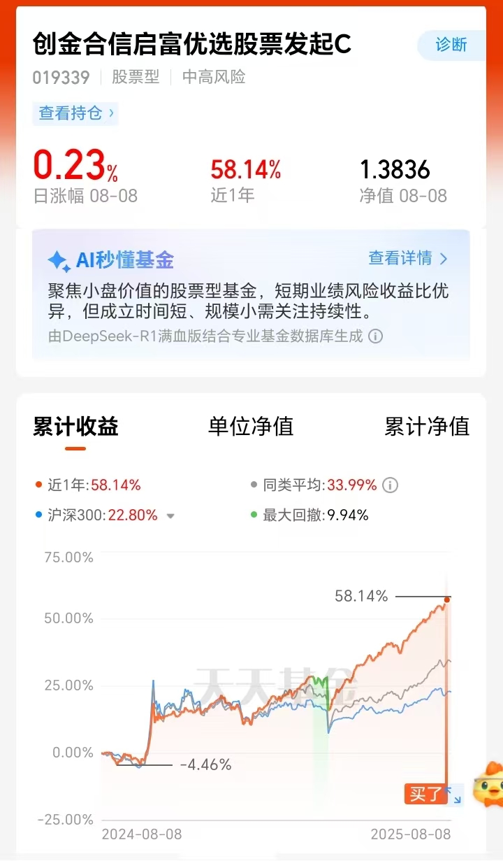 今天 A 股市场表现亮眼,高开高走,整体行情相当不错,行情持续反弹下,$创金合信启富优选股票发起C(OTCFUND|019339)$也表现出色,已经连续上涨 6 天了,近一个月涨幅达到了 7.18% ,近一年更是上涨了 58.14%,在同类基金中排名优秀。