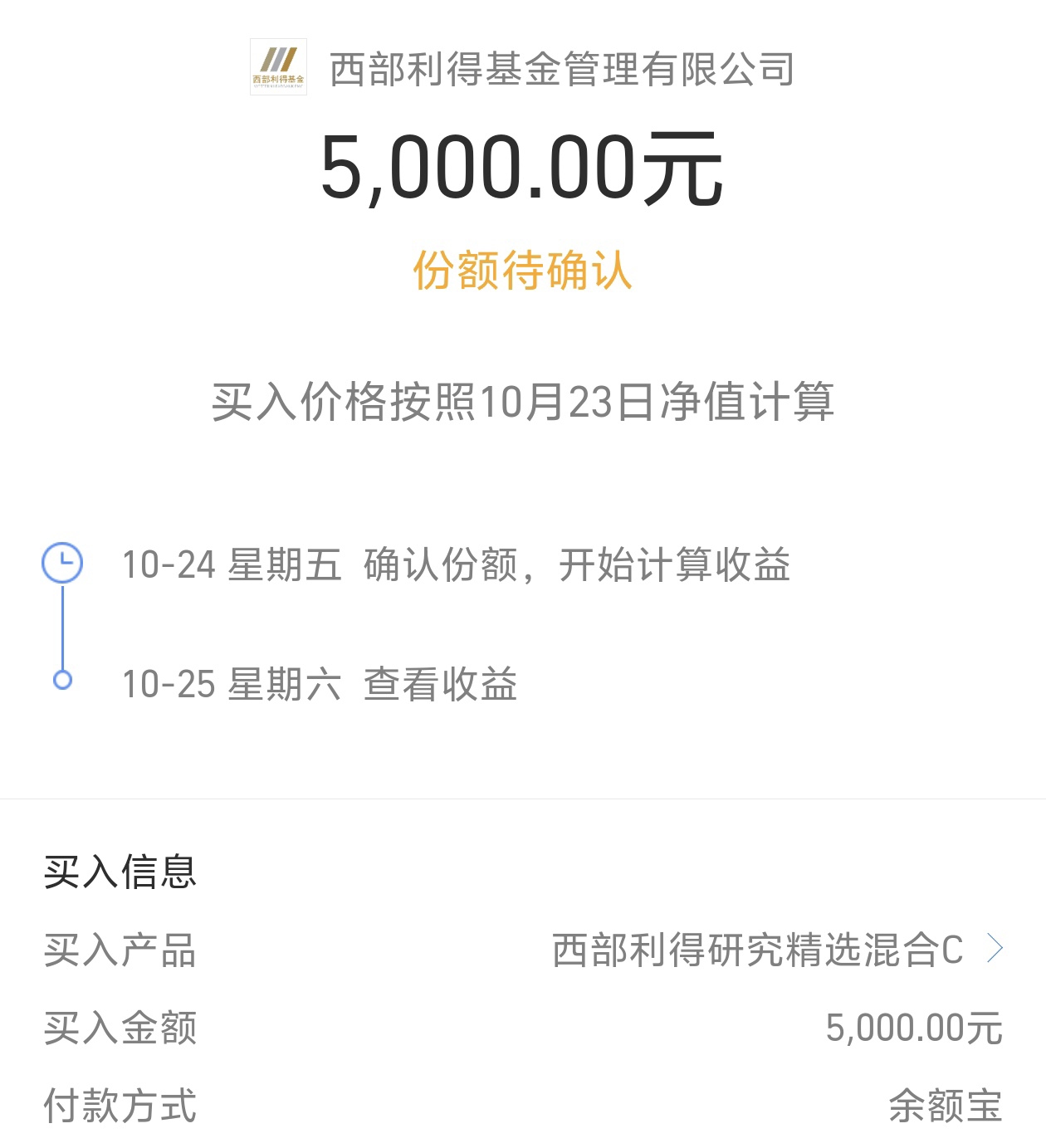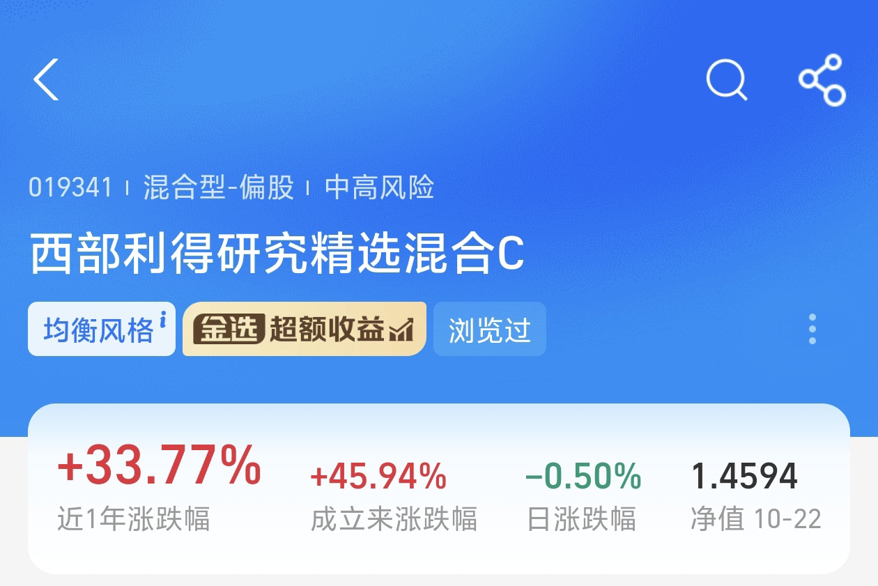 今天我也是抓紧上车了$西部利得研究精选混合C$ +5000元,基金历史业绩是非常的优秀,近三个月上涨了14.24%,近一年的收益率高达34.29%,盈利能力强。各阶段业绩在同类基金排名领先。是一只主动型偏向均衡风格的投资基金,抗波动能力强,具有超额收益。基金多元化的布局了制造、资源、科技、金融、医药等板块,行业分散度高,降低了单一行业波动的风险。同时能享受不同行业带来的发展机遇。全市场布局+收益稳定性,在市场行情中表现的也是能涨抗跌,非常的适合现在行业轮动速度快的行情。期待后期收益,坐等吃肉!