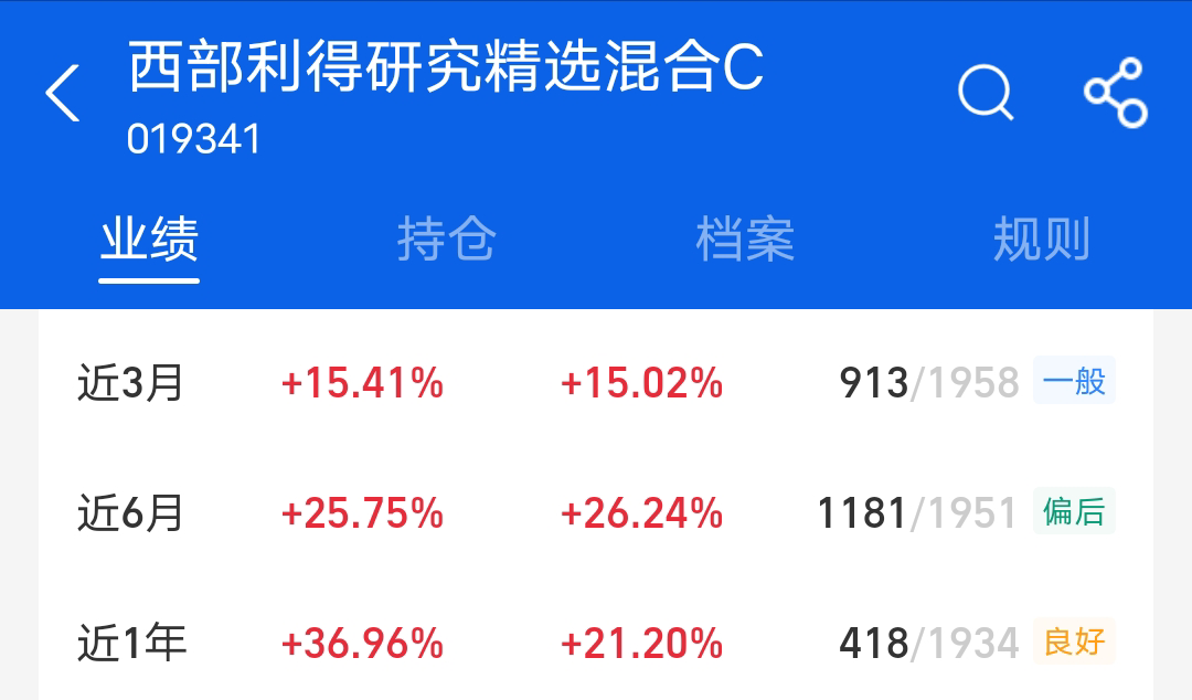 今天继续加仓1000这只$西部利得研究精选混合C$ ,昨晚涨0.99%不错啊,整体涨多跌少,业绩3连涨,持有期间感觉不错已盈利3个多点,看持仓就知道稳了,毕竟行业涵盖范围广泛,涉及周期,科技,消费,制造等热门领域,不单压单一赛道,均衡布局有效降低单一的风险,行情好时获取超额的收益,兼具弹性和稳定性,能抗又能涨,葛经理经验丰富,风格均衡的四维选股策略,一但发现确认性机会就会加大部分行业配置比例和重视回撤控制,相当稳健,从历史表现来看近1年上涨36.96%表现优秀跑赢同类排名领先,对标的中证800还超额了15个点,目前市场热点轮动较快, 均衡布局作为底仓配置还是不错的,继续上车一笔!
