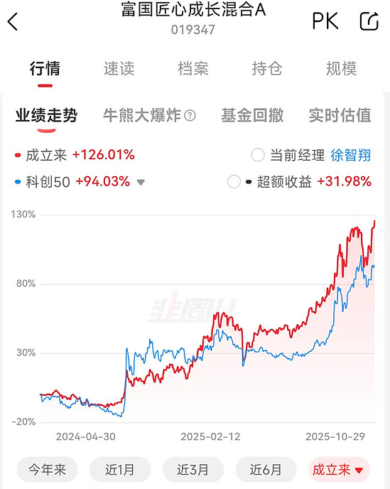 今天想重点介绍的是徐智翔管理的另一只产品——富国匠心成长(019347)。该基金成立于去年4月30日,运作至今收益高达126.01%,今年以来涨幅达94.53%,屡创新高,优于科创50指数,充分展现了他出色的投资能力。