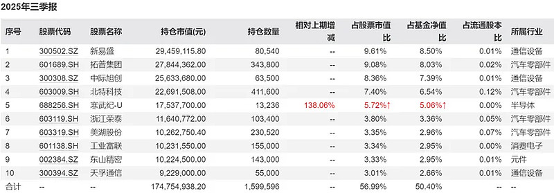 三季报发布后,富国匠心成长持仓方向更聚焦在配置 AI 上游基建(算力)和下游应用(机器人),以及固态电池。