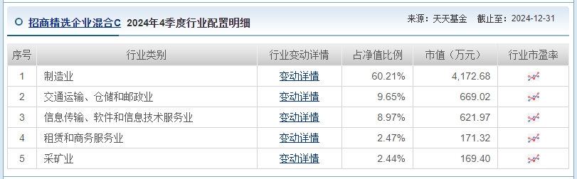 招商精选企业混合C基金在行业配置上展现出多元化的特点。根据最新的数据,该基金在制造业、交通运输、仓储和邮政业、信息传输、软件和信息技术服务业等多个领域均有布局。其中,制造业占据了最大的比例,显示出基金对实体经济和工业发展的重视。同时,交通运输和信息服务业的配置也体现了基金对现代流通和信息技术的高度重视。