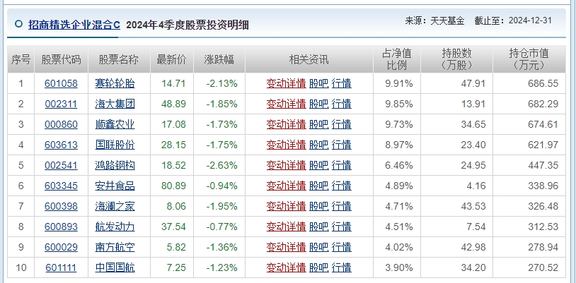 在具体的股票持仓上,该基金持有了一系列具有核心竞争力和成长潜力的企业,如赛轮轮胎、海大集团、顺鑫农业等。这些企业不仅在各自的领域内有着较高的市场占有率,还展现出良好的盈利能力和发展前景。