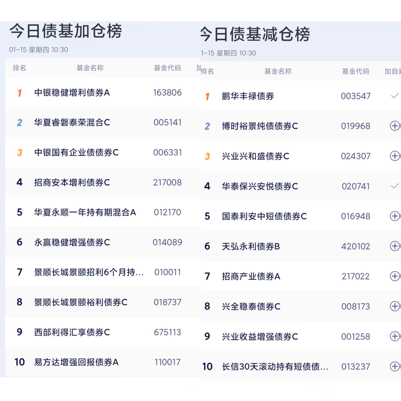 七、债券基金加减仓榜单