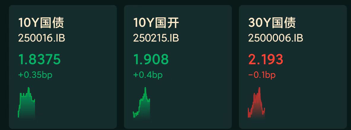 十年期国债收益率:1.8375%,+0.35BP(国债收益率越跌,债市越涨)