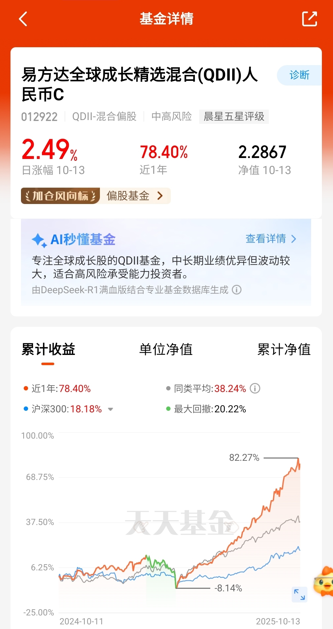 最近全球股市调整,但是我发现易方达全球成长精选混合(QDII)人民币C012922在我们国庆假期期间跑赢了美股港股呢。业绩走势亮眼。基金经理通过果断的全球范围内调仓,真是厉害,这两天有点回调就是加仓机会,而且单独看一个市场容易踏空或者风险过高,不如看看全球配置绩优低回撤的这只