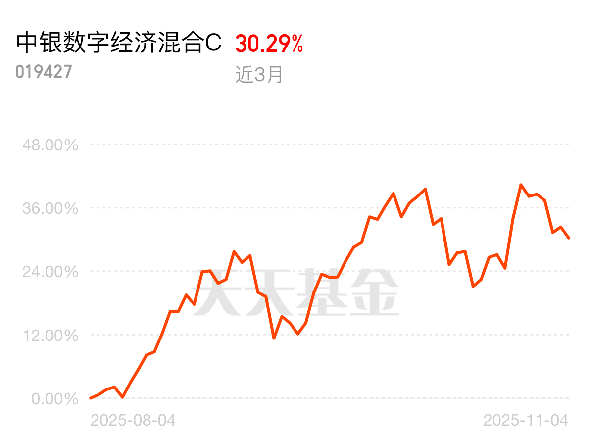 近三月有30个点,看起来还是很厉害的,趁着回调,建个底仓,希望后续可以起飞$中银数字经济混合C$