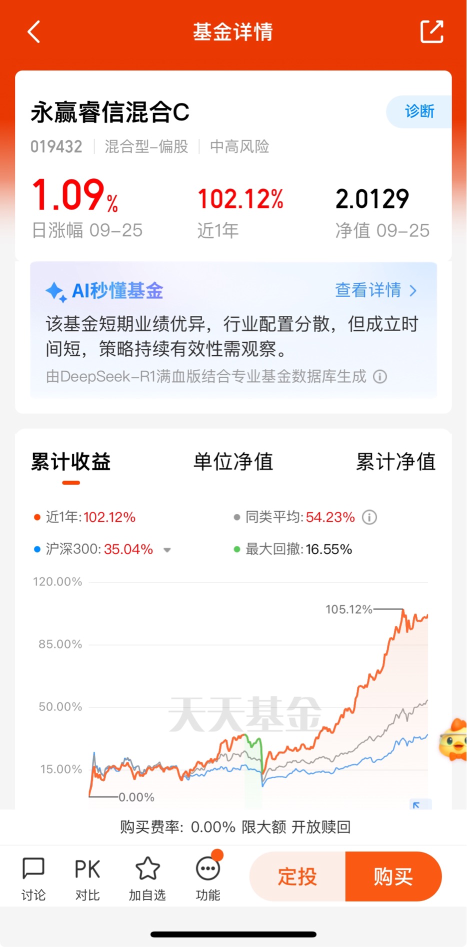 $永赢睿信混合C$昨天收1.09%,近3个月收43.24%,近6个月收58.45