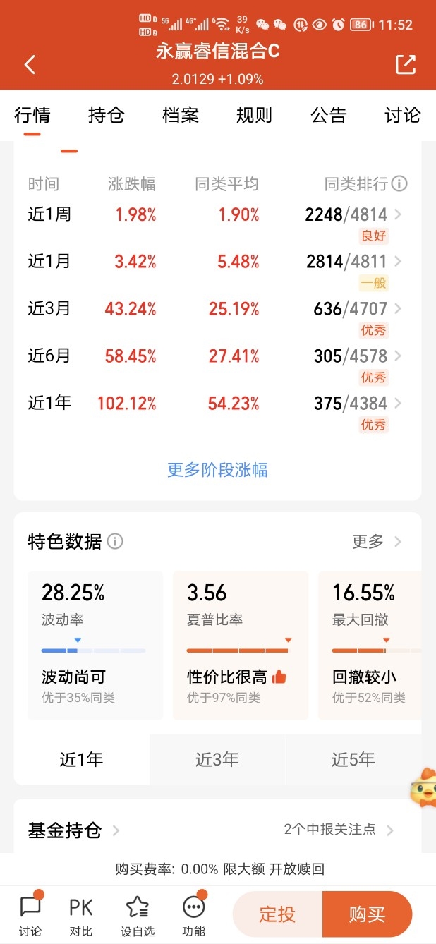 目前这个位置性价比还是很不错的,优于97%的同类,$永赢睿信混合C$ 跟着布局,期待后市发展,这个 凭借灵活的投资策略、优秀的风控能力和基金经理的经验,近期表现不错。未来在创新药、AI等高景气赛道及消费复苏背景下,有望延续稳健增长。业绩方面,我们可以看到中长期表现会更加亮眼。最近三个月的涨幅已经超过43个点,最近一年实现翻倍收益,经理的业务能力不错,期待收益节节高升。#创业板指创阶段新高 致敬“924行情”#
