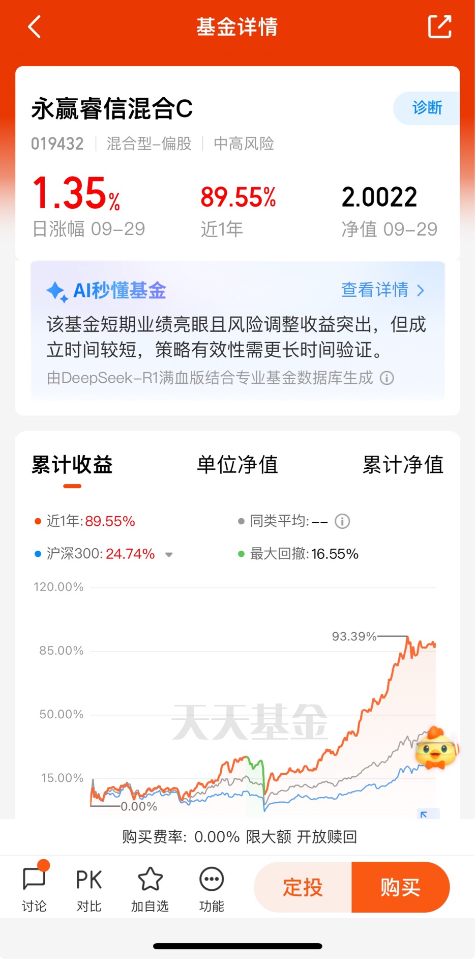 $永赢睿信混合C$ 今天收1.35%,近3个月收41.44%,近6个月收54.83%,近一年收89.55%,表现优秀!聚焦消费,新能源,医药,科技等领域,均衡配置各个龙头板块。凭借灵活的投资策略、均衡的持仓和优秀的基金经理,在当前市场中表现出较强的投资价值。