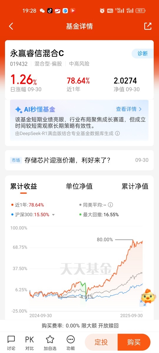 个人觉得节后仍有十足的上涨空间,所以今天果断上车永赢睿信混合C019432今天净值又涨1.26%,近三个月涨幅40.71%,近六个月涨幅54.72%,在同类排行中排名优秀,有名将高楠掌舵,上车啦。不能错过银十好行情。