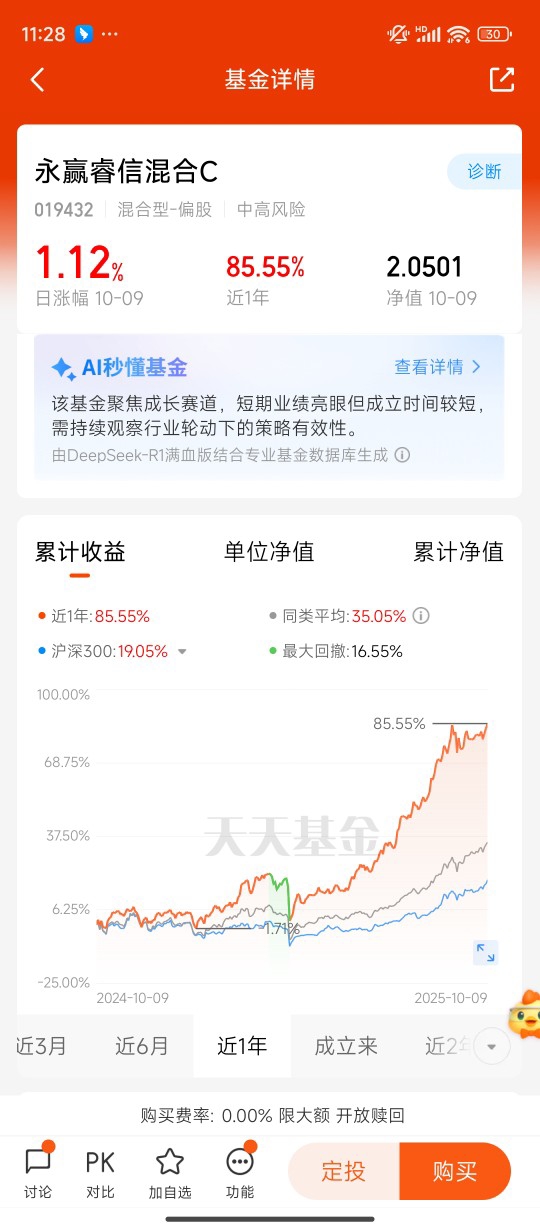 #国庆档电影你看了哪部?# 节后开门红行情来了。$永赢睿信混合C$ 昨晚大涨1.12%。连涨趋势,真的给力,近三月涨幅38.16%。近半年涨幅达到77.31%。近一年涨幅85.55%。赛道优势凸显。聚焦消费,创新药,科技三大高景气领域,布局AI算力,国产创新药等标的。采用成长波动率双资产配置,持仓均衡且灵活调整,受益于消费复苏与科技政策,捕捉产业红利,发展前景很好!
