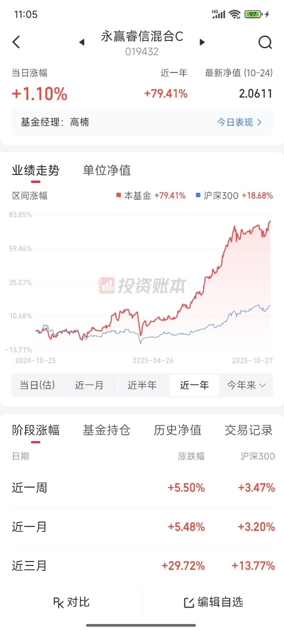 上证指数企稳3900点了,没上车的可以安心上车了,永赢睿信混合019432今天估值又大涨1.10%,近一年收益77.88%,基金经理高楠来自北大+港大双硕士,管理基金4.8年,规模超百亿,历史业绩优秀,经历过多轮牛熊。