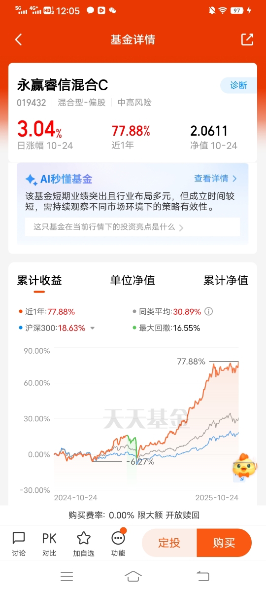 #宁德时代Q3净利润185.5亿元!如何解读?# 近期多元配置基金业绩亮眼,成为心头好。$永赢睿信混合C$ 周五暴涨3.04%。近一月3.51%。近三月涨幅27.14%。近半年涨幅65.92%。近一年涨幅达到77.88%,业绩优秀有实力。行业配置较为均衡。覆盖消费,医药制造等领域。兼顾了成长性与稳定性。经理把控能力强。行业趋势发展前景广阔。