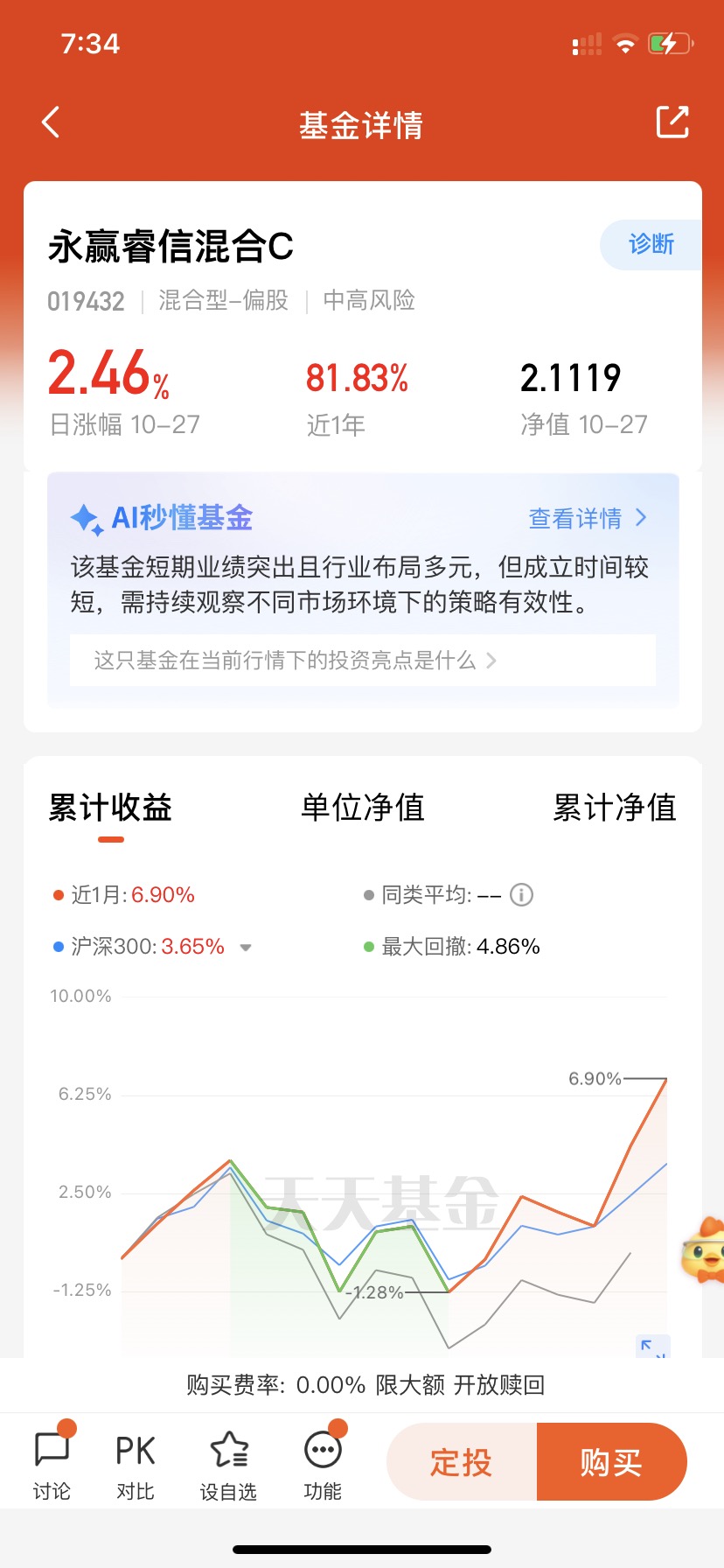 $永赢睿信混合C$ 今天涨了2.46%,二连涨了,上周五天三涨,涨多跌少,涨势向上啊!近三个月涨超31%,近半年涨超69%,近一年涨超81%,各个阶段业绩表现都优秀的很了!永赢睿信是混合型基金,重仓主要配置通信设备、轻工制造和创新药等领域,还是很值得期待了!#沪指逼近4000点!明天能否突破?#
