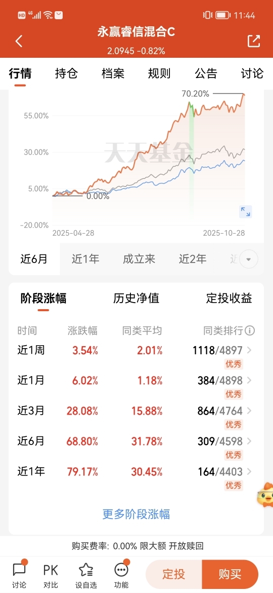 均衡配置高景气度成长领域的医药,科技,新能源三大主流赛道的$永赢睿信混合C$ 近一周涨3.54%,近三个月涨28.08%,近一年79.17%的涨幅,各阶段业绩表现均很优秀。经理高楠展现了较强的选股能力和行业轮动能力,继续看好后市,相信永赢睿信会有更好表现。#CPO、PCB大反攻!行情空间有多大?#