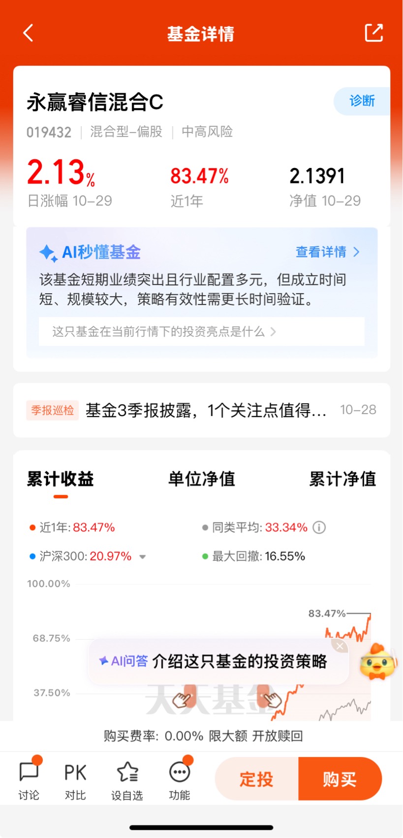 #英伟达市值突破5万亿美元!啥信号?# $永赢睿信混合C$ 昨天上涨2.13%,近一周收益6.37%;近三个月收益27.12%,近六个月收益71.54%,近一年收益83.47%,长期业绩优秀。永赢睿信C行业配置较为均衡,涵盖消费、新能源、医药、科技、周期等板块,降低了单一行业波动对基金净值的影响。基金凭借优秀的业绩、灵活的投资策略和基金经理的经验,具备一定的投资价值。