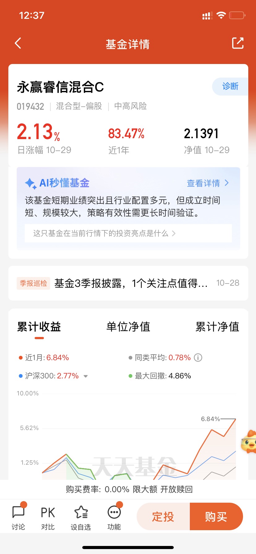 $永赢睿信混合C$ 昨天涨了2.13%,四天三涨,近三个月27.12%涨幅,近半年71.54%涨幅,近一年83.47%涨幅,业绩表现还是很优秀的了!从这里的净值表现来看,这里波动小回撤低,对于混合型基来说,配置均衡,又有这样的业绩表现确实不错!值得关注了!#CPO、PCB大反攻!行情空间有多大?#