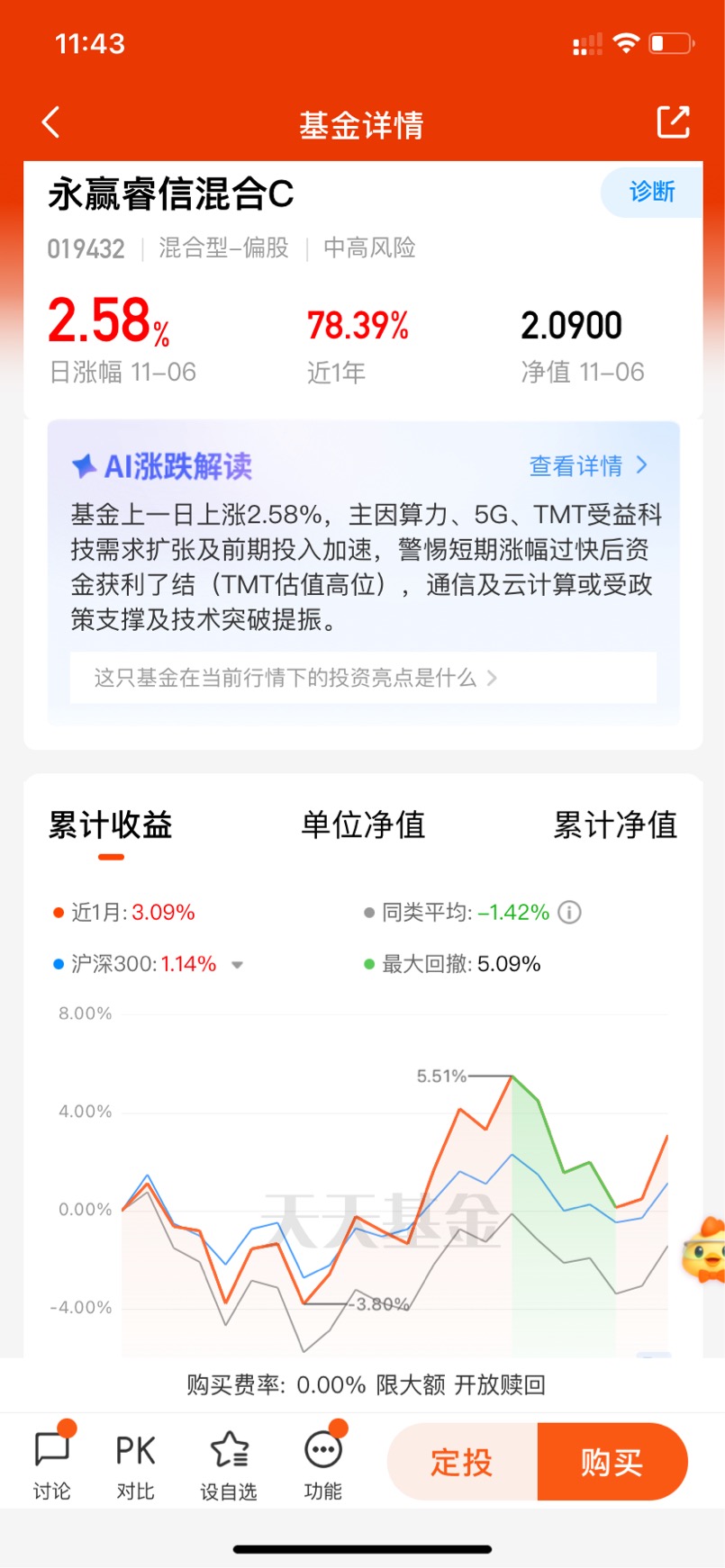 $永赢睿信混合C$ 昨天涨了2.58%,四天三涨,状态不错啊!近三个月涨超22%,近半年涨超63%,短期业绩爆发力很强啊,阶段业绩表现都很优秀,远超同类平均表现,可见弹性十足,是优秀的一个!!永赢睿信是混合型证券投资基金,前十大重仓都是高景气的板块,值得期待了!#11月基金投资策略#