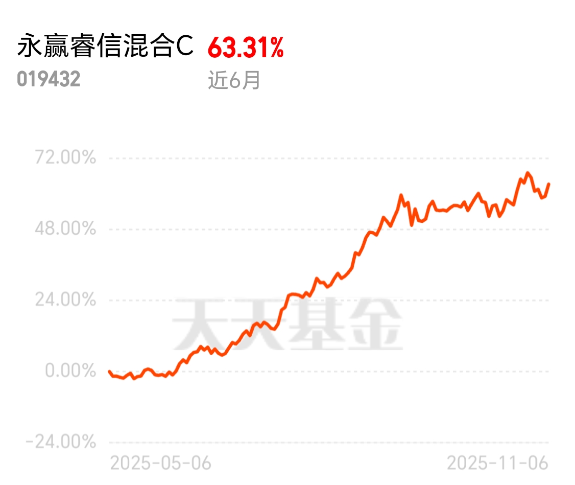$永赢睿信混合C$ 通信(12.36%)、有色金属(9.89%)、电子(5.99%)多赛道布局,捕捉科技周期与资源品机会。前十大重仓股占比42.54%,个股配置相对均衡,避免单一标的风险过度暴露。昨天涨2.58%,连涨2天,近三月涨22.61%,近半年涨63.31% 业绩远超同类均值,目前看走势良好,趁今天回调,准备买点试试。