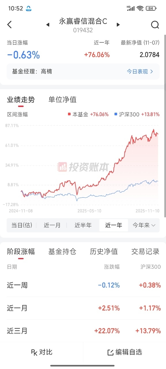 今日大盘震荡,最近的市场行情处于震荡蓄力阶段,要抓住这一次回调机会,上车永赢睿信混合C019432,这只近一年涨幅78.10%,在同类排行中排名优秀,持仓有消费电子、光伏电池等等都是主流赛道,有名将高楠掌舵,上车啦。