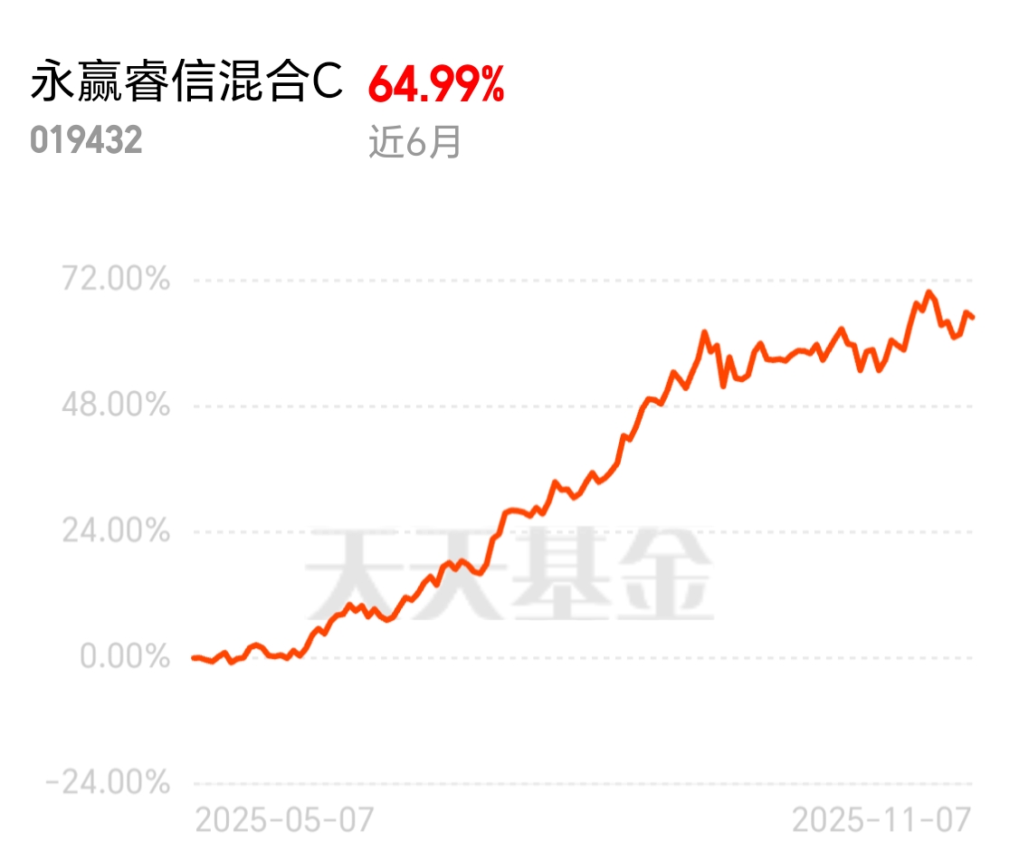 近三月涨超23%,近半年涨超64%,业绩远超同类均值,看来基金经理的资产配置,攻守兼备。$永赢睿信混合C$