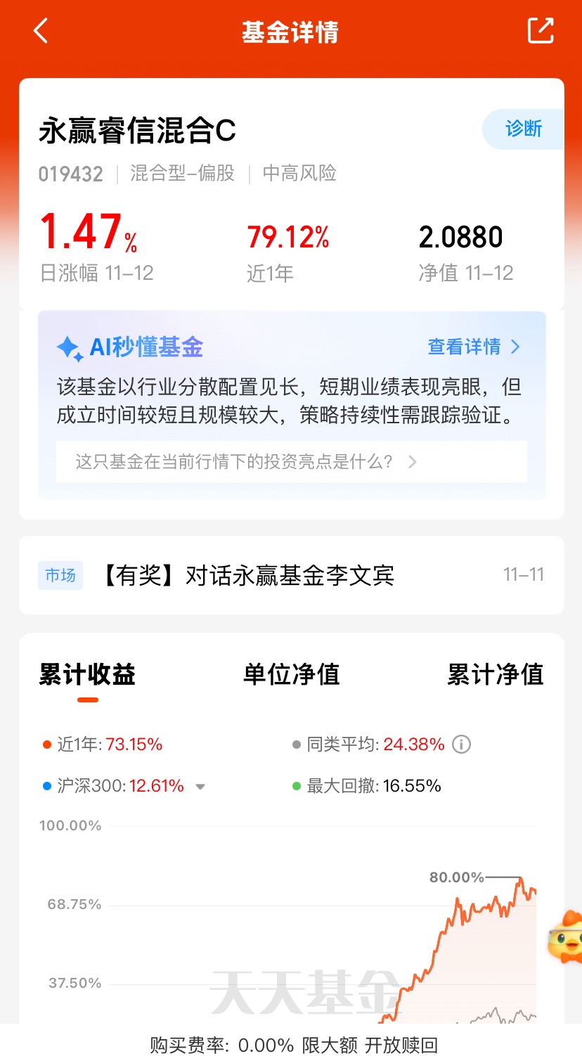 #大消费板块逆市拉升!行情能否持续?# $永赢睿信混合C$ 年内净值增长超过79个点,今天逆势上涨1.47%,近三个月收益20.83%,近六个月收益66.89%,近一年收益79.12%,各阶段的业绩优秀,该基金前十大重仓股覆盖通信、有色金属、医药、电子等热门行业,分散风险的同时聚焦高景气赛道。三季度大幅增配有色金属板块,减持部分创新药标的,体现了对市场趋势的敏锐判断;随着规模扩大,基金可能进一步优化持仓结构,增加中大市值公司配置,降低单一行业集中度风险。