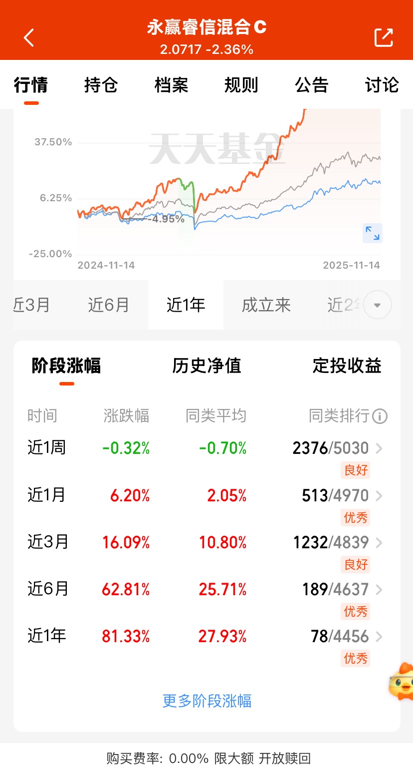 #锂电池行业拐点确立!锂电大周期来了?# $永赢睿信混合C$ 近三个月收益16.09%,近六个月收益62.81%,近一年收益81.33%,成立以来累计收益达107.17%,收益实现了翻倍,基金以通信、有色金属、医药生物为主,兼具轻工制造、汽车、电子、电力设备等行业,行业分布较为均衡,以分散风险并捕捉不同领域的投资机会。未来在AI、创新药等核心赛道的持续布局下,有望延续良好的业绩表现。