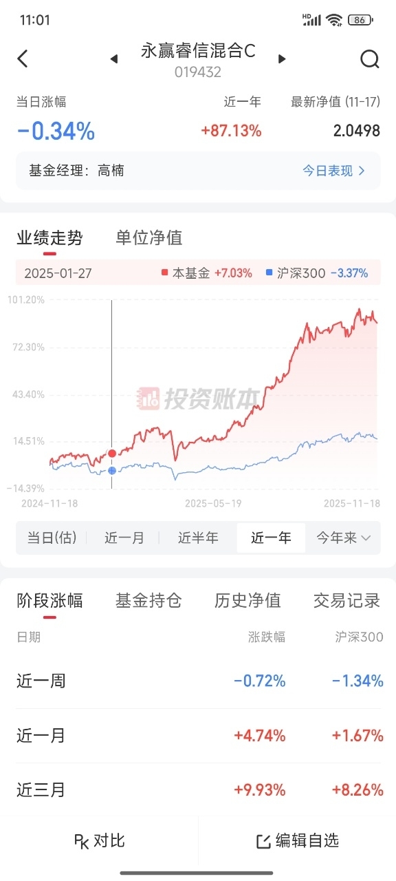 今日大盘震荡回调,最近的市场行情处于震荡回调阶段,没上车要抓住这一次回调机会,上车永赢睿信混合C019432,这只近一年涨幅83.53%,在同类排行中排名优秀,持仓有消费电子、光伏电池等等都是主流赛道,有名将高楠掌舵,上车啦。