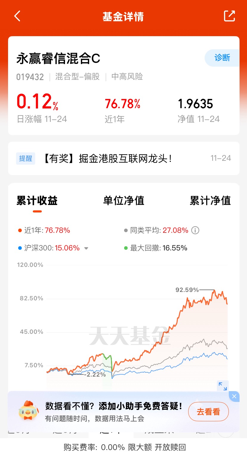 $永赢睿信混合C$昨天微涨0.12%,近六个月收益55.13%,近一年收益76.