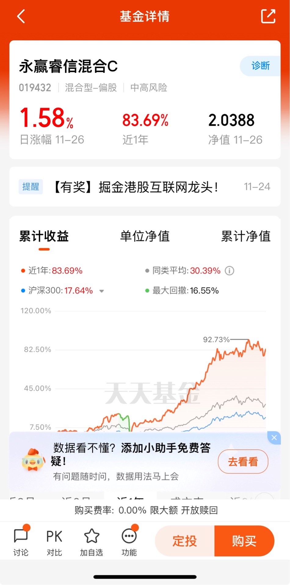 $永赢睿信混合C$昨天收1.58%,已经3连涨模式了,近3个月收5.69%,近6
