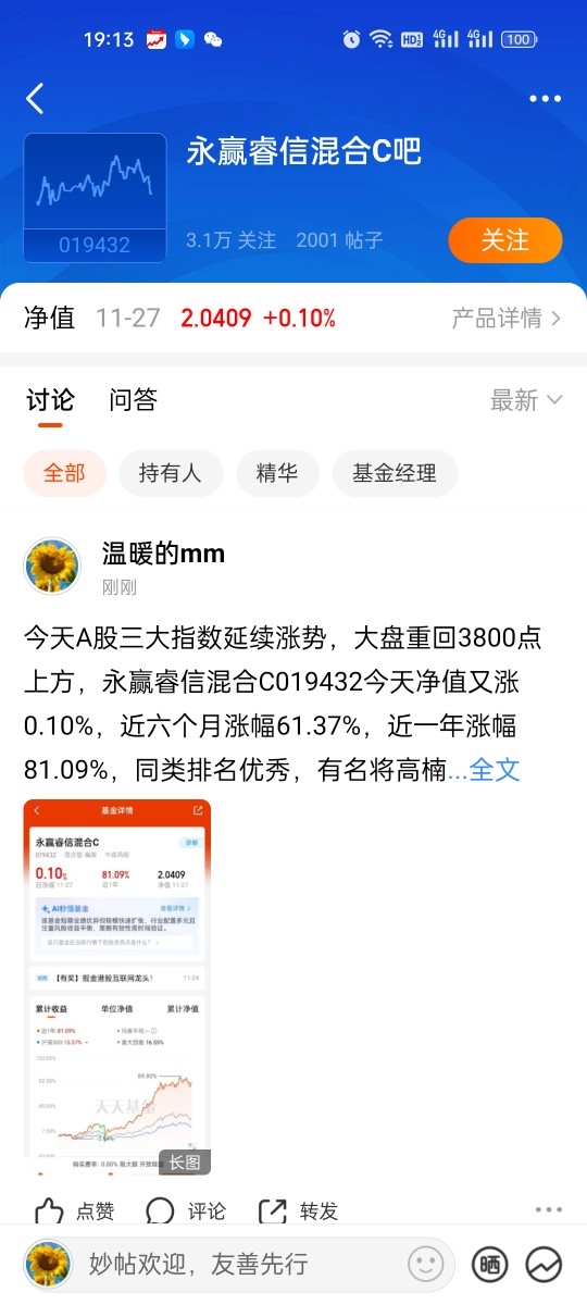 今天上证指数延续涨势,大盘重回3800点上方,永赢睿信混合C019432今天净值又涨0.10%,近六个月涨幅61.37%,近一年涨幅81.09%,同类排名优秀,有名将高楠掌舵,上车,不能错过年底好行情。