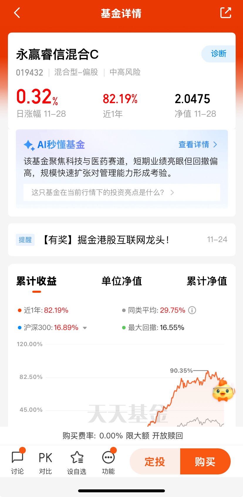 #3800点的A股值得加仓吗?# $永赢睿信混合C$ 上一个交易日上涨0.32%,近三个月收益5.28%,近六个月收益62.62%,近一年收益82.19%,长期业绩优秀,该基金三季度持仓覆盖通信、有色金属、医药生物等热门行业,分散风险的同时聚焦高景气赛道;随着基金规模扩大,高楠表示会根据市场情况调整投资节奏,适度关注大盘蓝筹等赔率型资产,以平衡规模增长与收益稳定性。