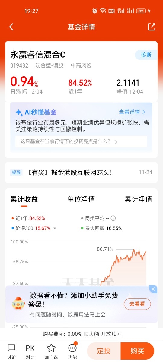 近期上证指数整体呈现震荡格局,但永赢睿信混合C019432几乎没跌,今天净值又大涨0.94%,近六个月涨幅60.84%,近一年涨幅84.52%,同类排名优秀,持仓有医药、科技、消费、制造等等,上涨趋势非常不错,今天开始分批布局起来。