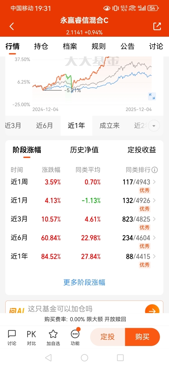 $永赢睿信混合C$ 各阶段业绩表现均很亮眼,多元布局多赛道,均衡配置的策略还是很靠谱的;近一年涨幅84.52%;经理高总展现了较强的选股能力和行业轮动能力,将资金分散到不同行业中,降低了投资风险。而且,该基金的风险分散,收益也比较稳定。#12月基金投资策略#