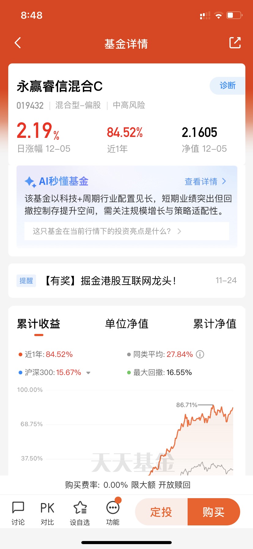 $永赢睿信混合C$ 今天涨了2.19%,三连涨了,十天九涨,这状态杠杠的啊!近半年涨超60%,短期业绩爆发力很强啊!永赢睿信主要布局通信CPO、医药、汽车零部件等高景气度赛道,这种多元化布局完全可以降低重仓单一赛道带来的回调风险,值得继续期待了!#12月你看好哪条投资主线?#
