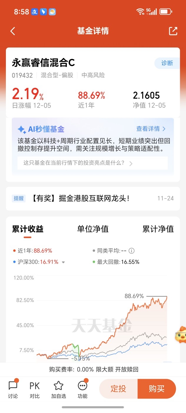 $永赢睿信混合C$ 聚焦于具备长期价值创造能力的优质企业,侧重于捕捉市场情绪、政策周期与流动性环境驱动的阶段性机会。今天上涨2.19%,近六个月涨62.38%,近一年88.69%的涨幅,业绩表现很不错。均衡配置降低了单一行业风险,看好就跟上,你值得拥有。#12月基金投资策略#