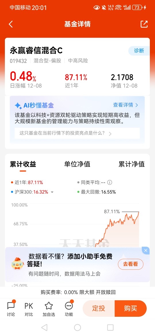 $永赢睿信混合C$ 各阶段业绩表现均很优秀,布局多元化赛道,均衡配置的策略还是很靠谱的。经理高总展现了较强的选股能力和行业轮动能力,将资金分散到不同行业中,降低了投资风险;今日更是产下48蛋,近一年涨幅+87.11%,未来可期呀。#券商行业迎利好:杠杆上限“松绑”#