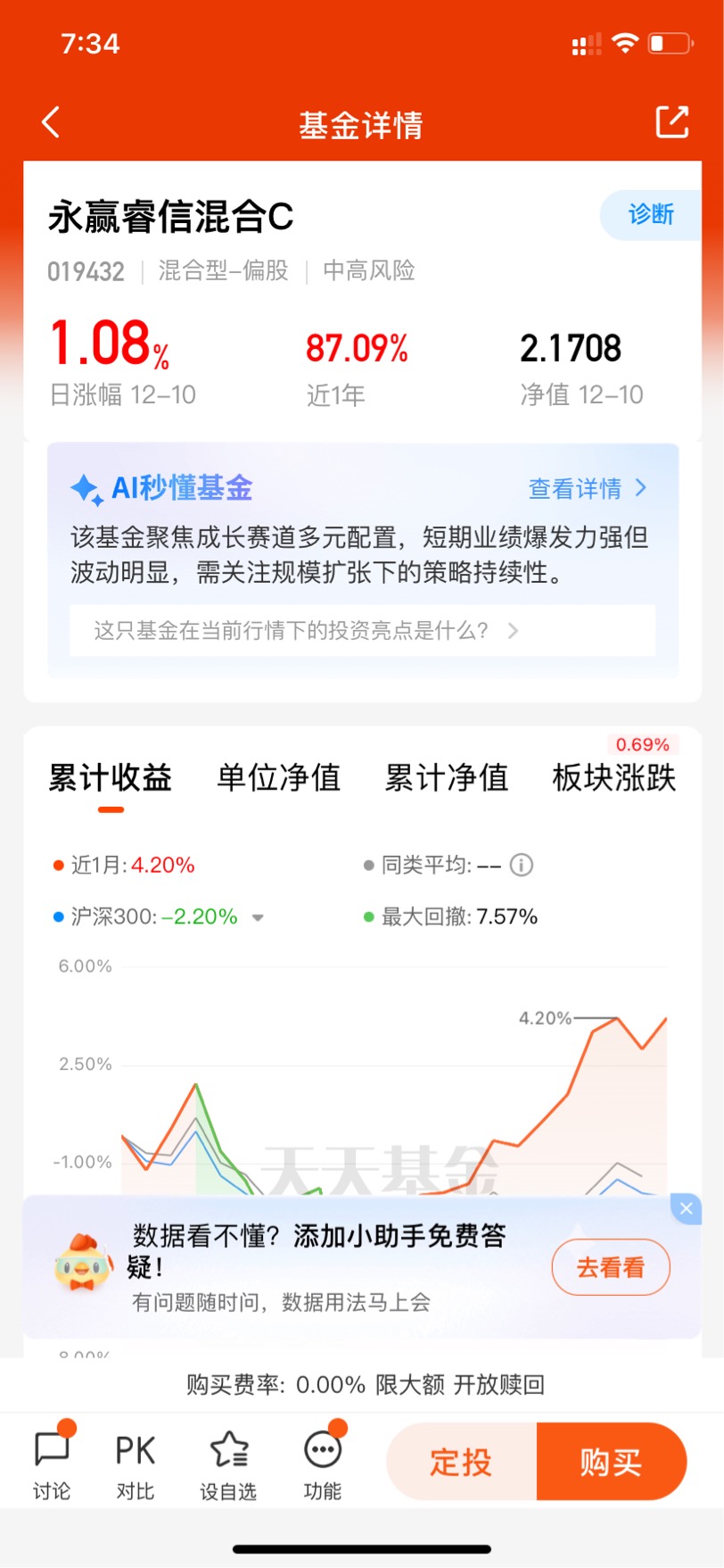 $永赢睿信混合C$ 今天涨了1.08%,六天五涨,最近状态可以啊!震市行情下表现的如此稳健,很抗波动的一个了!近半年涨超59%,近一年涨超84%,短期业绩弹性很强,爆发力十足啊!各个阶段业绩表现都优秀亮眼的很了!这里主要布局通信CPO、医药、汽车零部件等,持仓均衡,这样的配置完全可以规避单一赛道带来的风险,值得继续期待了!#茅台批价两年跌43%!反映了什么问题?#