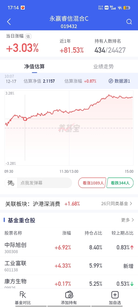 大盘行情上涨的趋势,这基今天估值涨3.03%,表现不错的