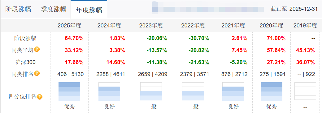 这只基金是双核基金经理,但大家更熟悉傅鹏博这位老将。我自己也曾经是持有者,曾经有段时间很难熬,比如2022年跌30个点、2023年跌20个点;直到2025年,这只基金涨幅64.70%,成为我去年赚钱的主力基金,才挽回了一丝颜面。