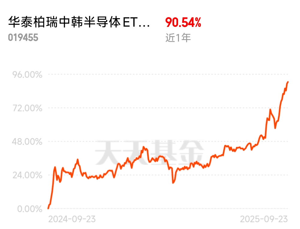 . 韩国股市创新高,中韩半导体是主力。华泰这只近一年90.54%的涨幅太亮眼了,近一周还贡献了4.64%,全球资金都在布局。$华泰柏瑞中韩半导体ETF发起式联接(QDII)C$