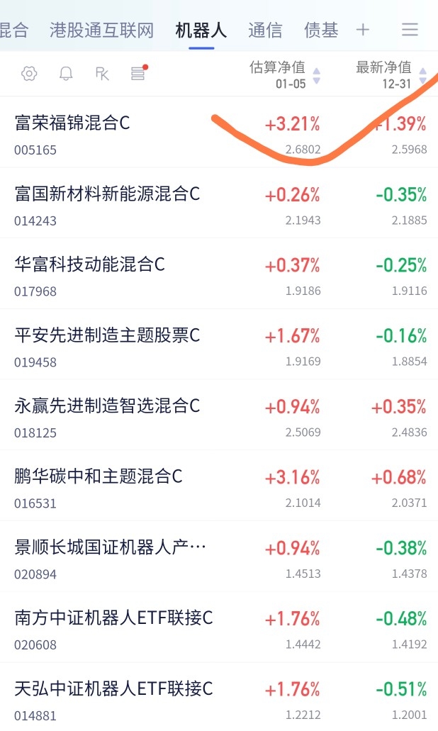 今天大盘开门红,机器人也不示弱,迎来了大涨,$富荣福锦混合C$估值3点多了,聚焦