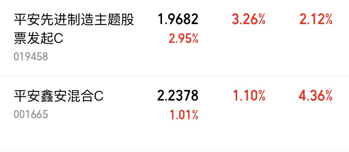 新的一年我还是更加看好科技,尤其是投成长股涨起来更有弹性,来看看平安家族今天更新的情况,$平安先进制造主题股票发起C$ 今天涨幅3.26%,最近机器人概念最近超热,利好多多,近一年涨幅62.37%,今天$平安鑫安混合C$ 也不错,涨了1个多点,这个布局电网设备这种服务于基建设施的基金,逻辑挺长,慢慢看。