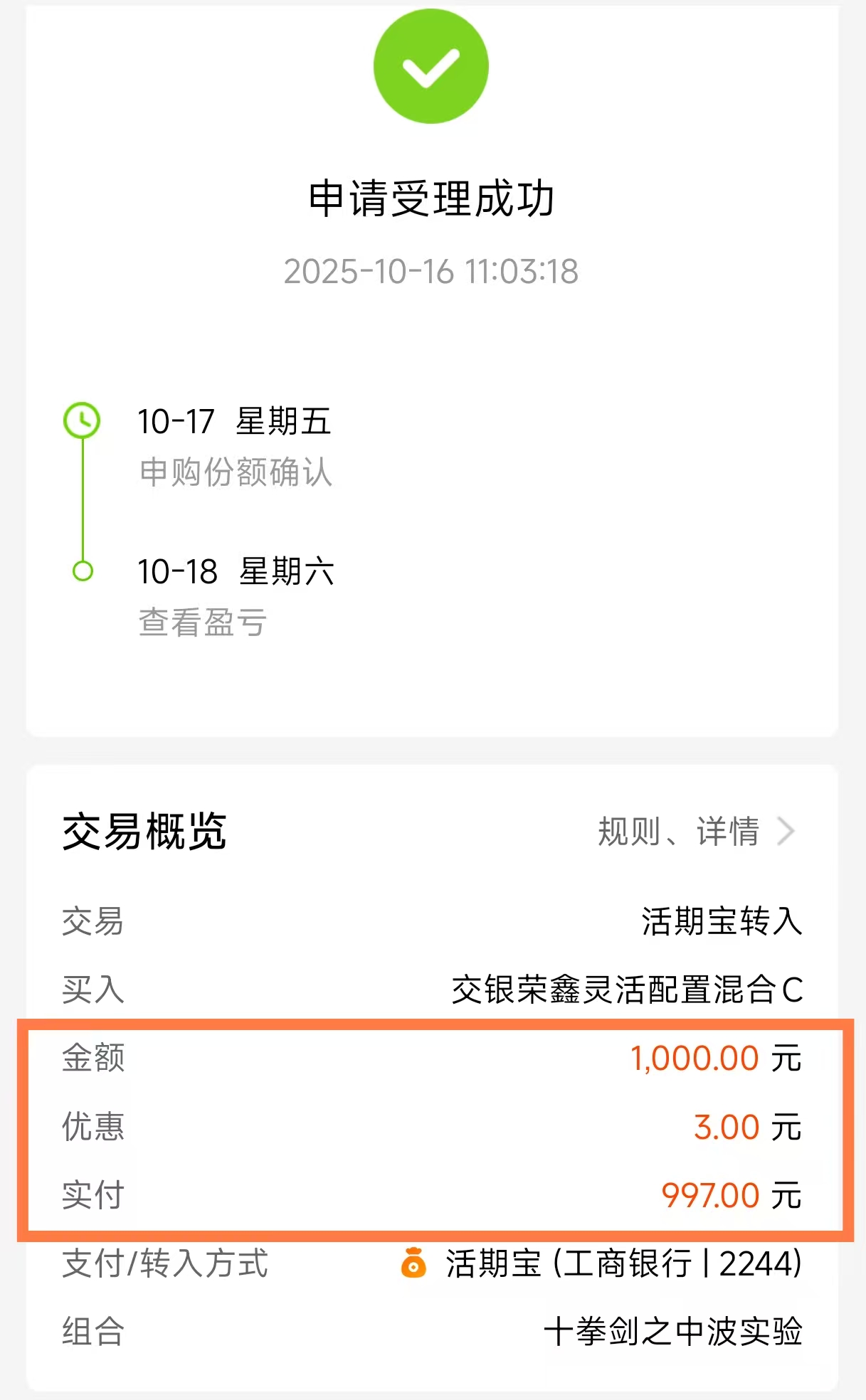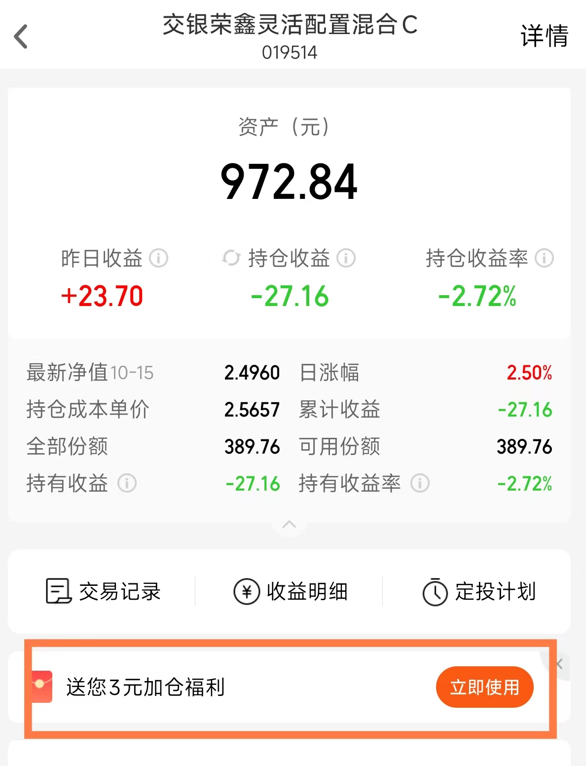 具体操作上,我今天在科技成长这块继续加仓了1000$交银荣鑫灵活配置混合C(OTCFUND|019514)$。在加仓的时候发现,交银送了满1000减3元的福利,再加上C类份额0申购费,变成负手续费了!