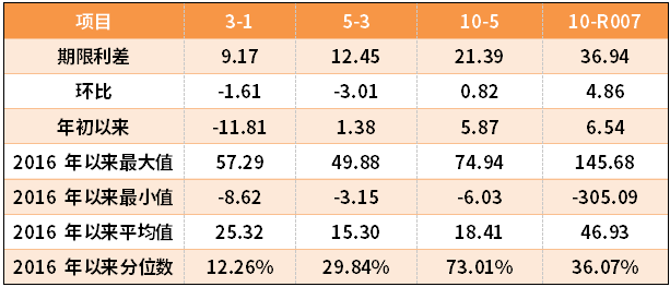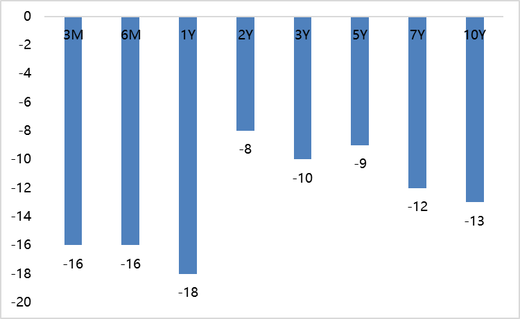 本周美债各期限收益率集体下行。本周10年期美债收益率下行13BP,10年期国债收益率下行1.19BP,中美利差倒挂程度减小。全周来看,1年期美债收益率下行18BP,3年期美债收益率下行10BP,10年期美债收益率下行13BP。