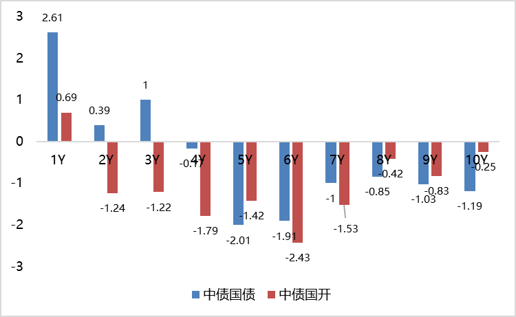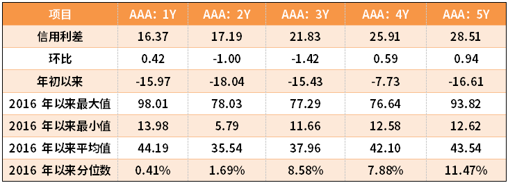 长期限高等级票据信用利差窄阔不一。中债1年期AAA级中短期票据信用利差走阔0.42BP,中债2年期AAA级中短期票据信用利差收窄1.00BP;中债3年期AAA级中短期票据信用利差收窄1.42BP。